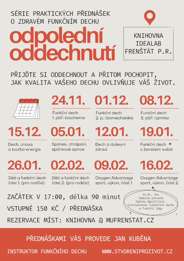 "Série praktických přednášek o zdravém funkčním dechu. Přijďte si oddechnout a přitom pochopit, jak kvalita vašeho dechu ovlivňuje váš život. Proběhne celkem 11 oddechnutí na různá témata, můžete si tak vybrat to, co vás zajímá - únava, spánek, ženské zdraví, děti a dech, sport a výkon..."