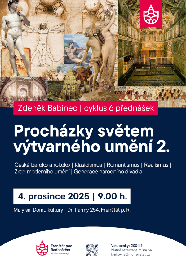 - Vstupné: 200 Kč / rezervace míst na knihovna@mufrenstat.cz
