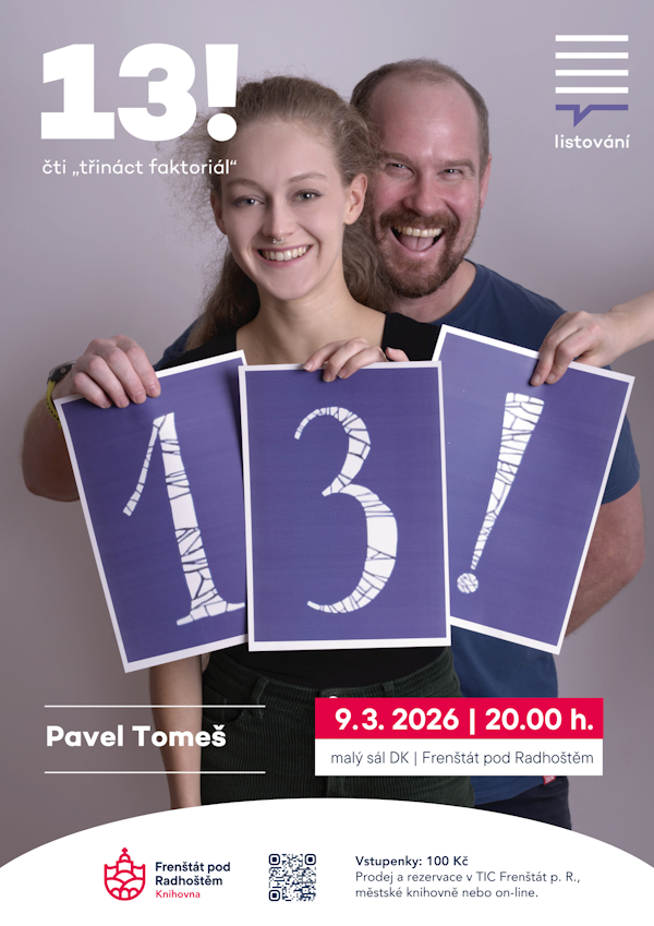 "Spisovatel, nakladatel, stand-up komik a fanda faktoriálu Pavel Tomeš napsal mozaiku povídek, která jasně ukazuje, že žádná tma není tak temná, aby ji neprozářil černý humor. Autor známého románu o smrti Až na ten konec dobrý získal s Třináctkou Cenu Miloslava Švandrlíka a také nominaci Magnesia Litera v kategorii humoristická kniha. Přijďte se na Listování přesvědčit, že 13! je šťastné a zábavné číslo." Hrají: Pavel Oubram a Zuzana Valešová