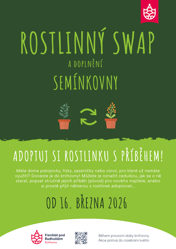 "Máte doma pokojovky, řízky, sazeničky nebo osivo, pro které už nemáte využití? Doneste je do knihovny! Můžete je označit cedulkou, jak se o ně starat, popsat stručně jejich příběh (původ) pro nového majitele, anebo si prostě přijít některou z rostlinek adoptovat..."