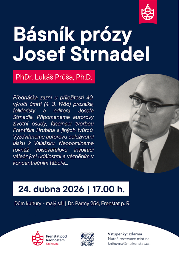 "Přednáška zazní u příležitosti 40. výročí úmrtí (4. 3. 1986) prozaika, folkloristy a editora Josefa Strnadla. Připomeneme autorovy životní osudy, fascinaci tvorbou Františka Hrubína a jiných tvůrců. Vyzdvihneme autorovu celoživotní lásku k Valašsku. Neopomineme rovněž spisovatelovu inspiraci válečnými událostmi a vězněním v koncentračním táboře..."
